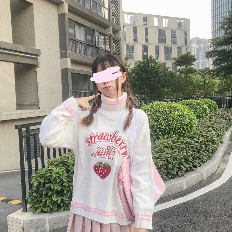 いちごミルクのイラストが可愛らしいボトルネックのニットになります。