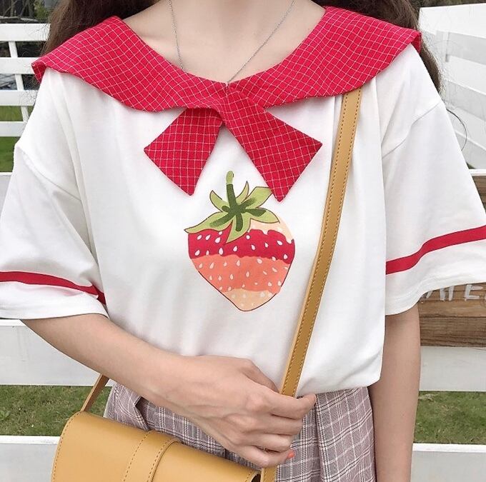 いちごのマークが特徴的なセーラー服風のトップスになります♪