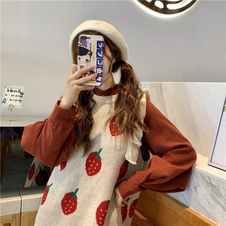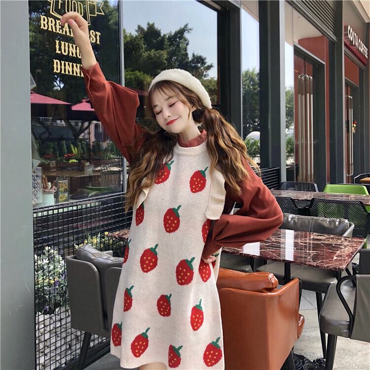 カントリー風のレトロなイチゴのニットワンピースになります。