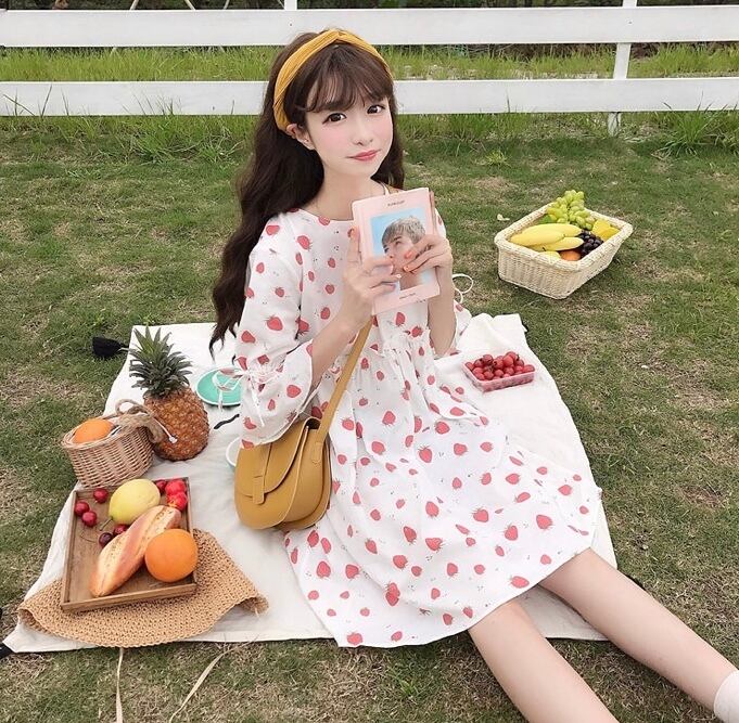 袖口のフリルがチャームポイントのひざ丈ワンピースになります。
